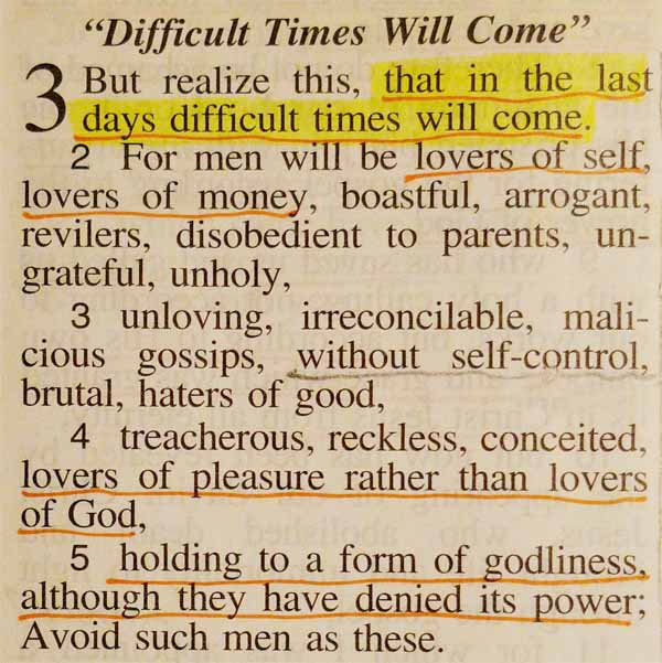 2 For people will love only themselves and their money. They will be boastful and proud, scoffing at God, disobedient to their parents, and ungrateful. They will consider nothing sacred. 3 They will be unloving and unforgiving; they will slander others and have no self-control. They will be cruel and hate what is good. 4 They will betray their friends, be reckless, be puffed up with pride, and love pleasure rather than God. 5 They will act religious, but they will reject the power that could make them godly. Stay away from people like that!